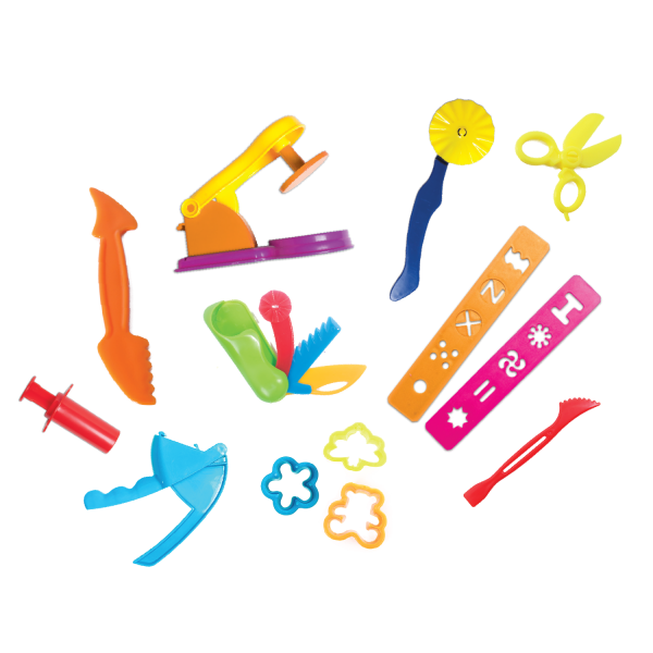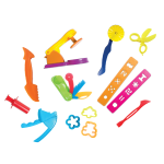 A surprise-package of assorted plastic cookie cutters go hand-in-hand with the Tutti Frutti modeling dough kits.