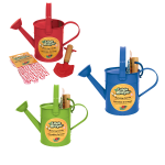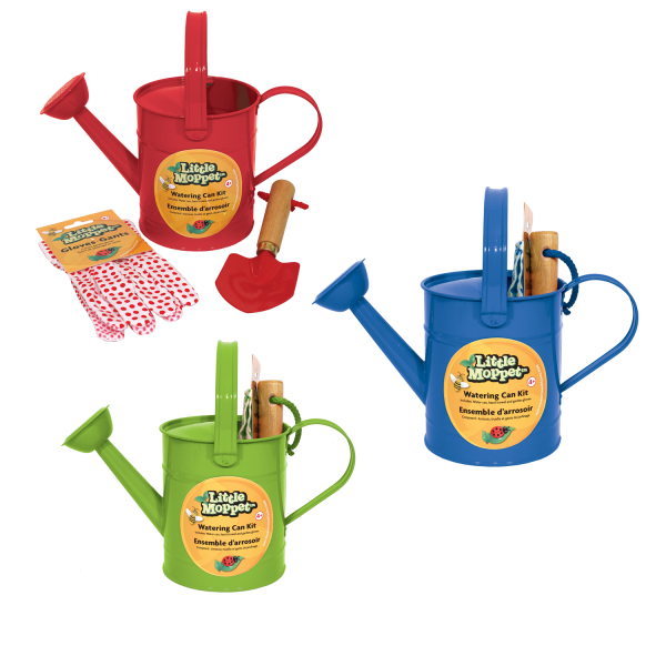 Little Moppet planting kits start flowers, veggies and children's imaginations growing! Made to accommodate small hands, plant the seed of fun by having them sow and maintain their very own garden. Watering Can Kits help children feed and care for their plants. Each kit contains a metal water can, a pair of garden gloves and a hand trowel. Kits come in blue, red, and green.