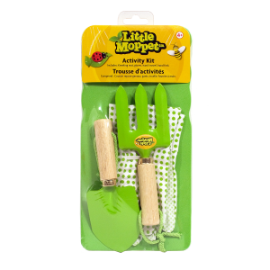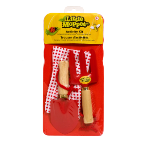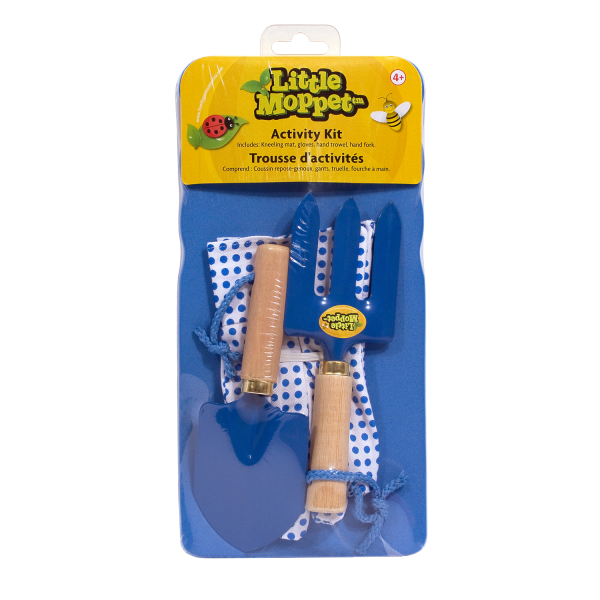 Get ready to do some digging! Included in the blue Little Moppet Garden Activity Kits is a blue  6 x 12 x 1 inch thick foam kneeling mat to protect your knees, a pair of blue polka-dot garden gloves, and a blue hand trowel and fork.