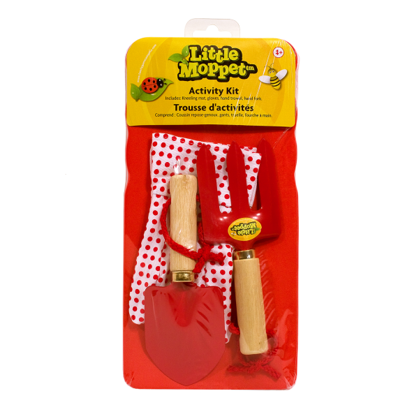 Get ready to do some digging! Included in the red Little Moppet Garden Activity Kits is a red 6 x 12 x 1 inch thick foam kneeling mat to protect your knees, a pair of red polka-dot garden gloves, and a red hand trowel and fork.