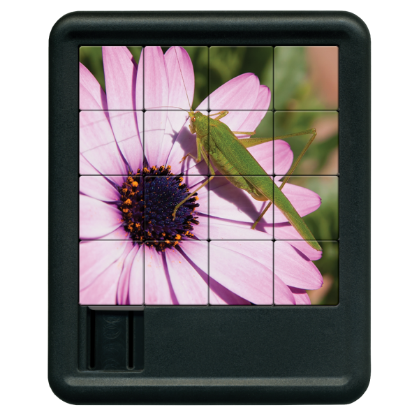 With a hop and a skip, or a hop and a slide, simply mix up the tiles and then try to recreate the beautiful grasshopper perched on a daisy.