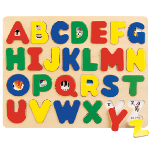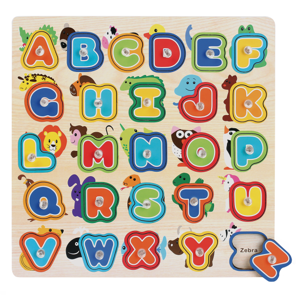 Twenty-six capital letters come in a rainbow of bright colors. Pull the cut-out pieces from the frame with the sturdy plastic pegs, then try to put them back in alphabetical order! Practice makes perfect.