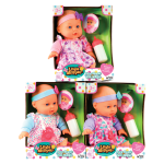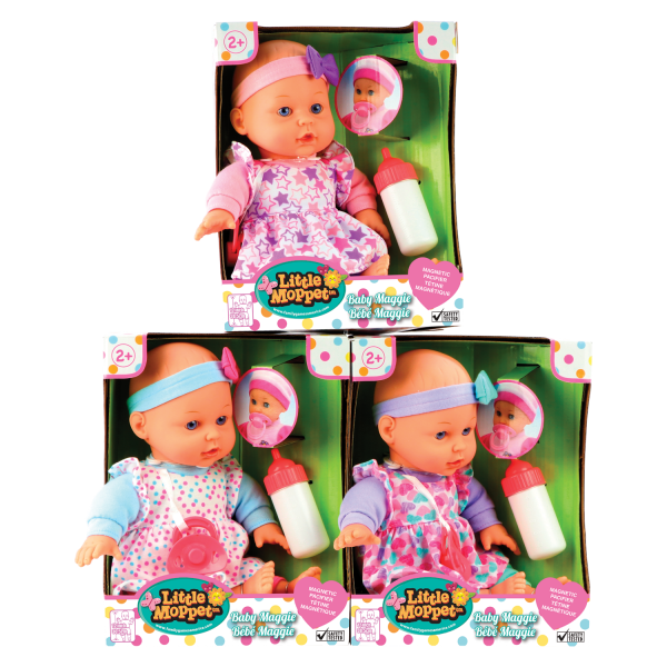 Three different clothing styles on the 3 different 12 inch baby Maggie dolls. Each delightful baby doll set includes a magnetic pacifier and milk bottle.
