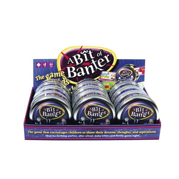 A Bit of Banter Jr. is a game where anyone can become the “Best Banterer” by sharing dreams, thoughts, fears and aspirations in a fun and non-threatening way. Ideal for 'tweens, baby-sitters and blended families, this junior edition encourages children to communicate. ENGLISH ONLY