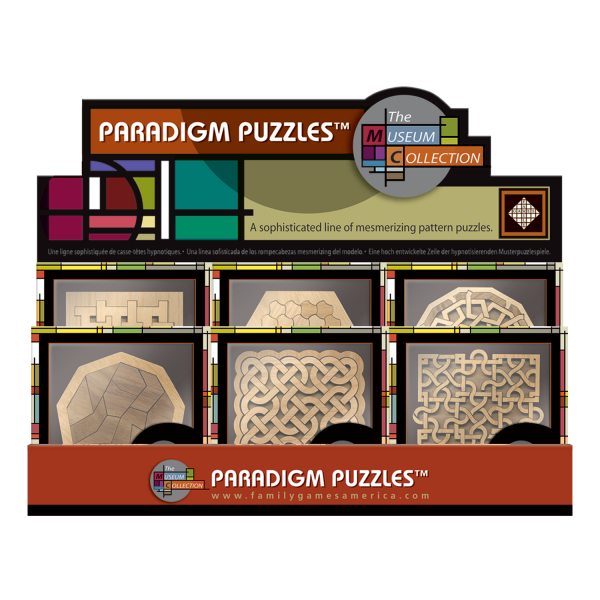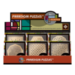The art-deco 2-tier counter merchandiser holds 12 assorted puzzle boxes. Open display: 12.25" x 18" x 8".