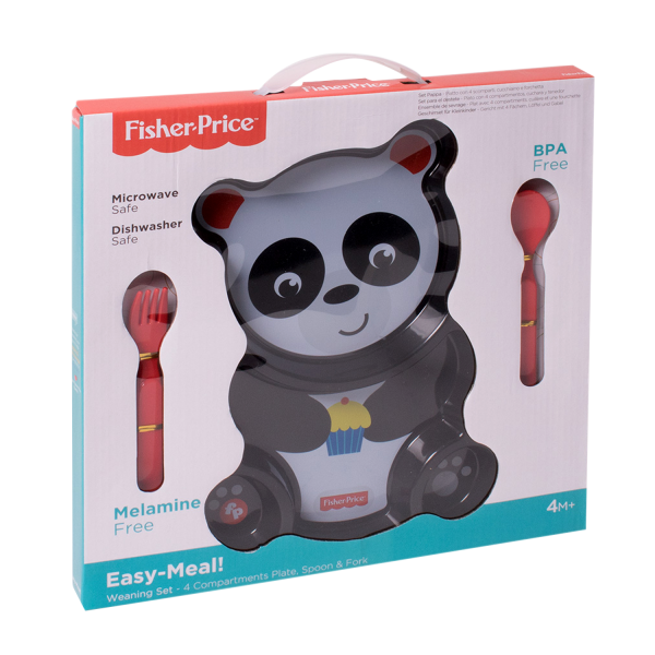 This fun melamine panda weaning set includes a 4 compartment plate, a spoon and a fork. PBA free. Ideal for 4 months.