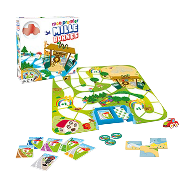 Mille bornes, a.k.a. a thousand milestones, is a classic card game of cross-country racing, challenging you to outrace your opponents as you dodge the hazards they put in your way. Protect yourself with safety cards, or save a safety for a classic maneuver ? Play your cards right, and you’ll be the first to cross the finish line! 2 - 4 players Age 6+
