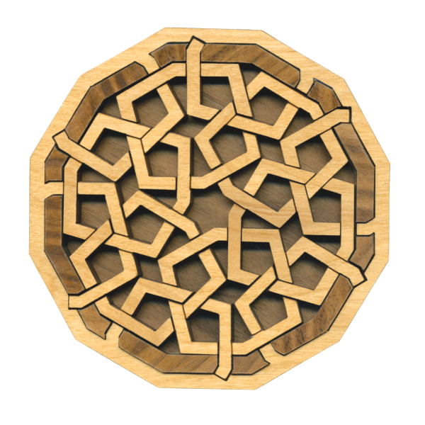 Intricately detailed laser-cut pattern pieces challenge puzzle players to refit the 'Interlace Diamond' pieces back within the frame. Based on an Arabic pattern, this 12-piece puzzle has a difficulty rating of 8/10.