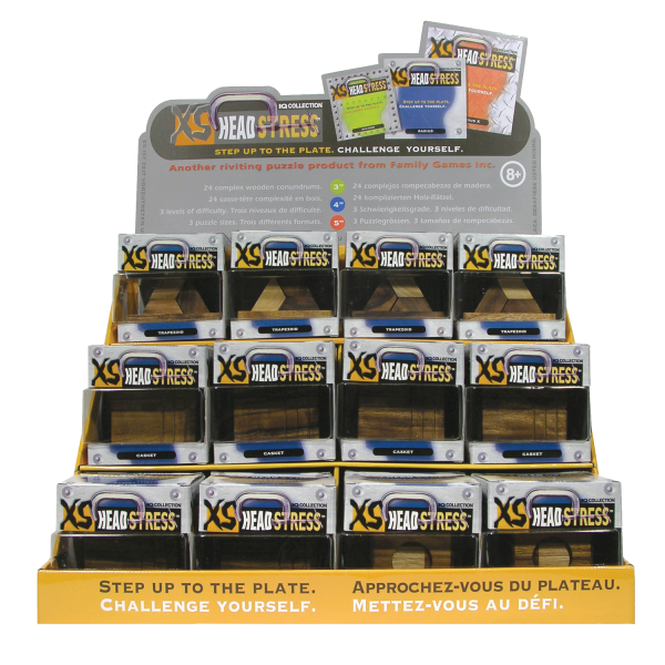 The art-deco 2-tier merchandiser holds 24 assorted wooden puzzle titles, and three levels of difficulty.