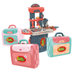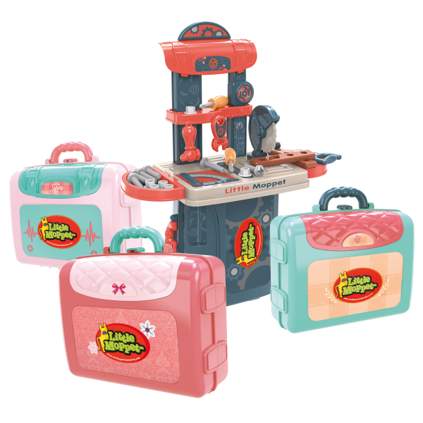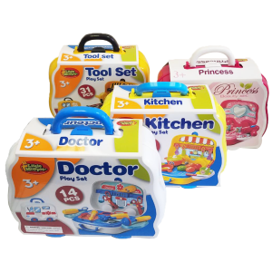 Four sturdy play sets expand from a case, into a work surface, then into a vertical workstation. Doctor, Kitchen, Beauty and Tool Set titles available.