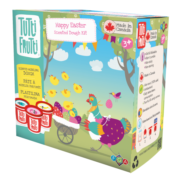 NEW FOR 2024 Take a pinch, or a handful of Tutti Frutti Sparkling Scented Dough. Then use the four double-sided stick and stain resistant outline cards to help form your glittery Easter themed creations. Daisy, Bunny, Baby Chick… Or, make your own designs! The Color Blending Chart shows you how to mix colors to attain endless color and aromas variations. FOR USA ONLY