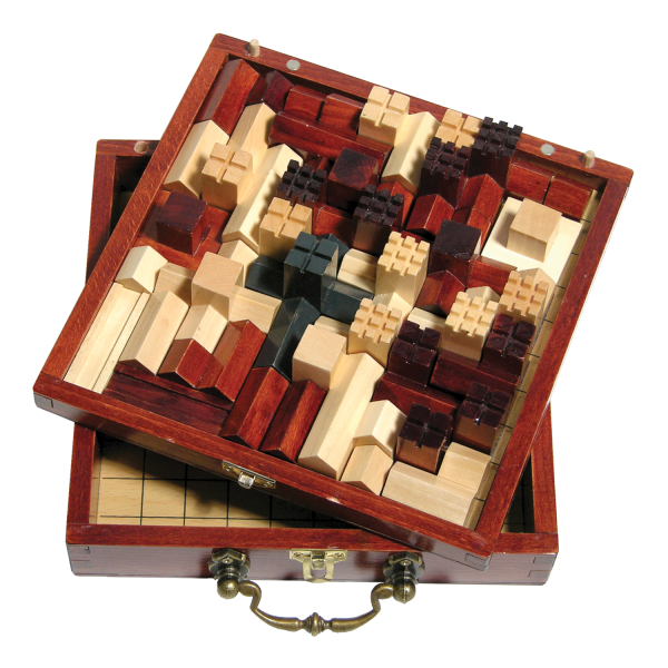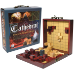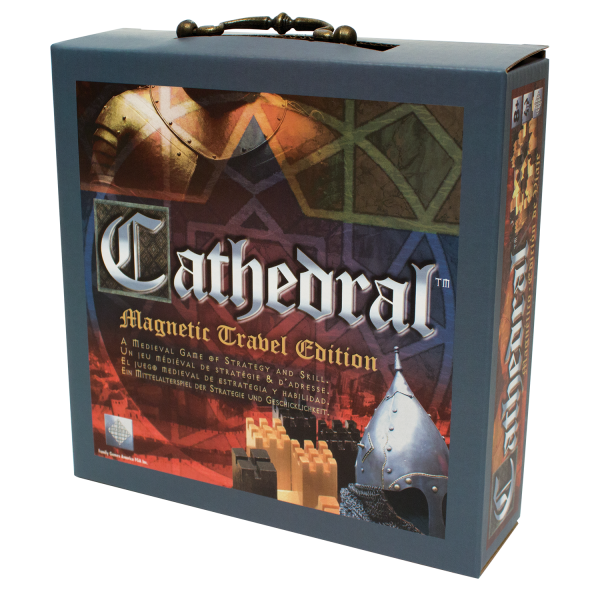 Conceived by Robert Moore, a pilot in the Royal New Zealand Air Force, this travel version of the original Cathedral game features magnetized pieces and playing surfaces to keep pieces in place while on the move. Victory goes to the landowner who can position more of their buildings within the game board walls, thereby capturing space, points and blocking the opponent from placing their pieces.